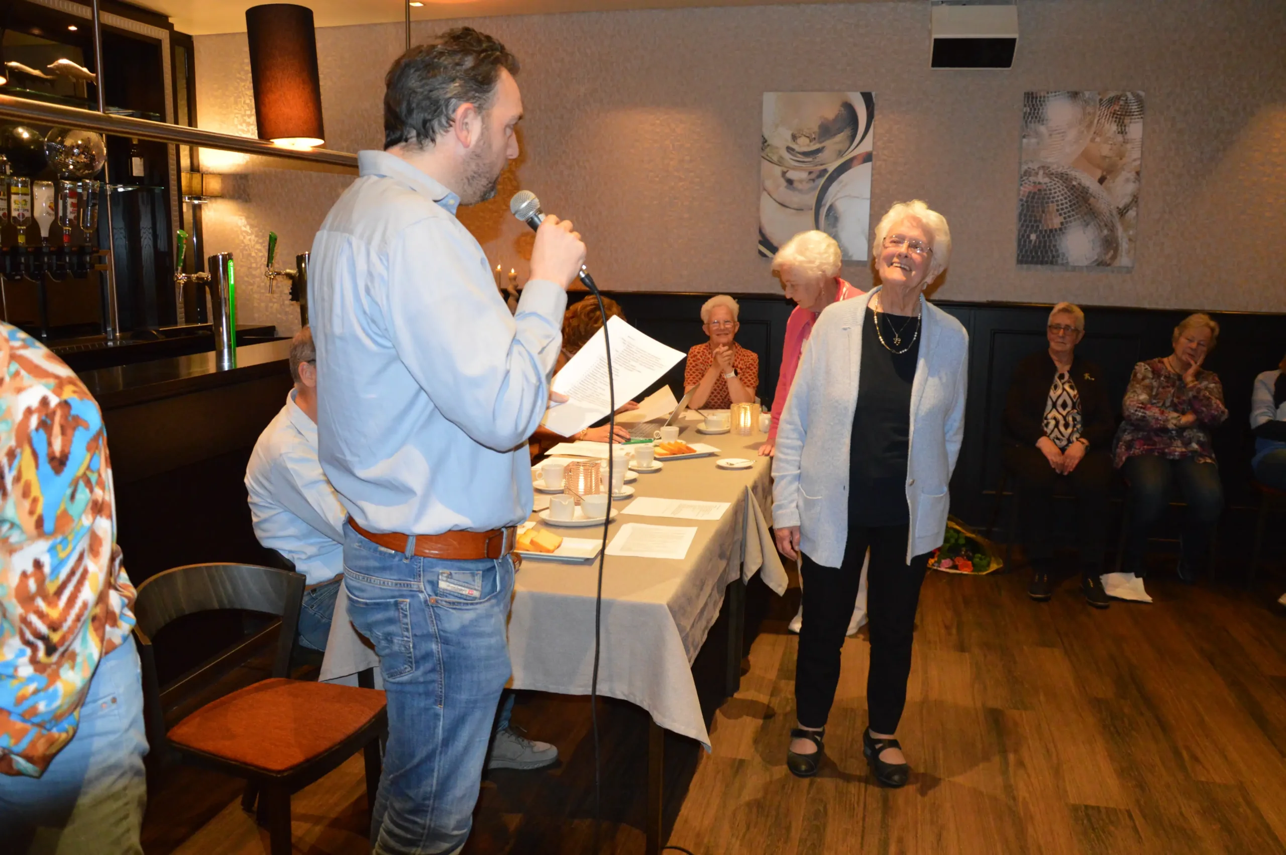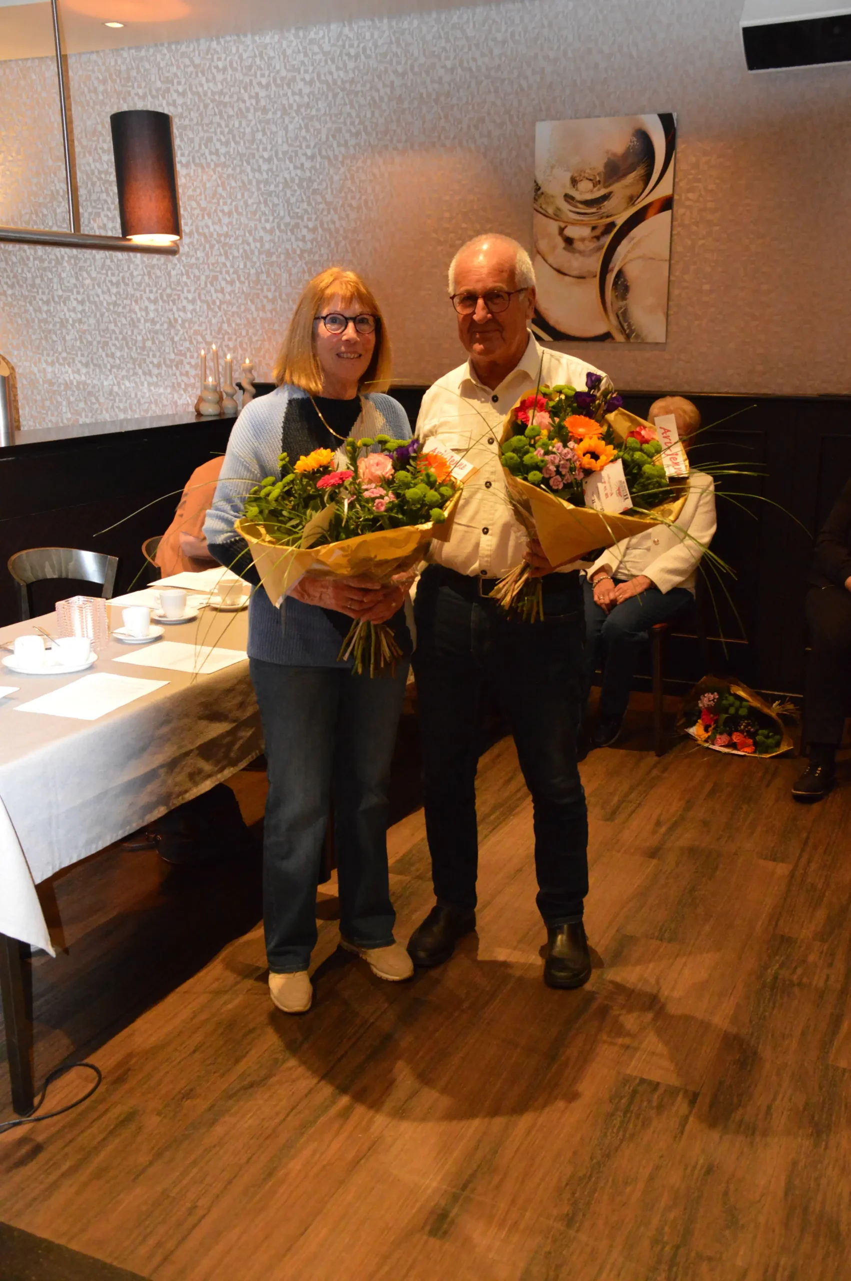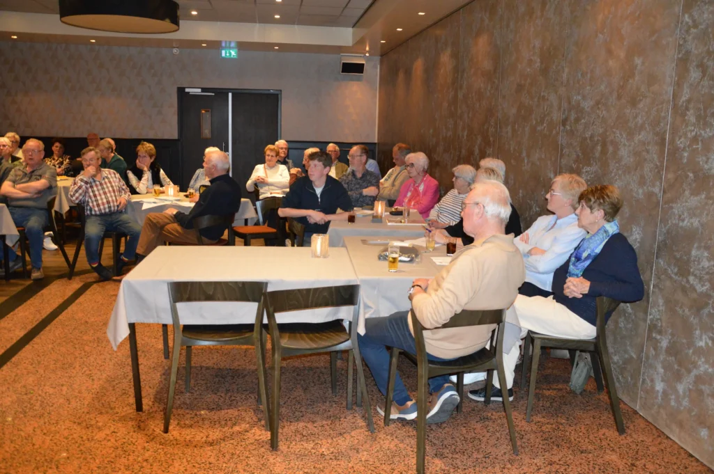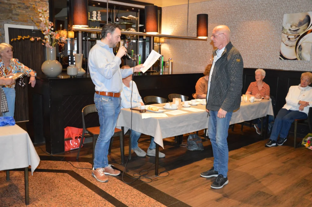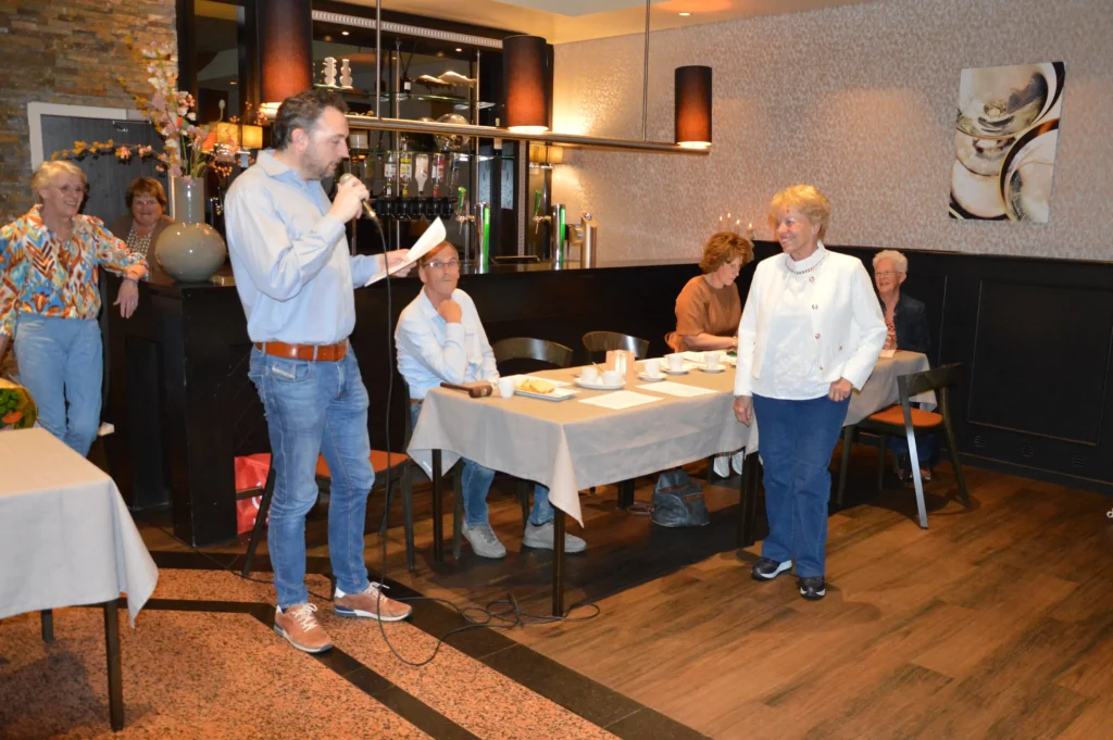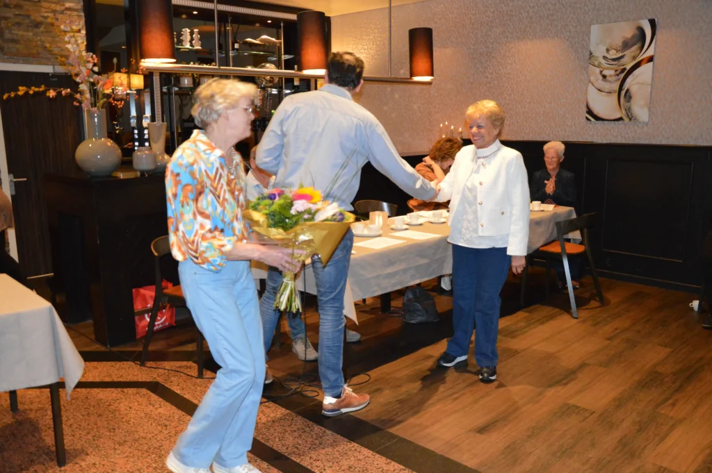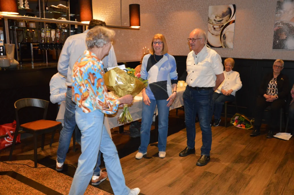 Vlak voor de pauze was er speciale aandacht voor de jubilarissen. Vijf vrijwilligers – Frans Gielis, Clazien Heesakkers, Arna en Wies van Leur en Jan Roefs – zijn al 12,5 jaar actief voor de vereniging. Frans Gielis zorgt ervoor dat de post op de juiste adressen terechtkomt. Clazien Heesakkers houdt zich bezig met onder andere de doelgroepenlijst, de inkoop en het inpakken van kerst- en paasattenties en is als begeleider actief bij onze activiteiten.