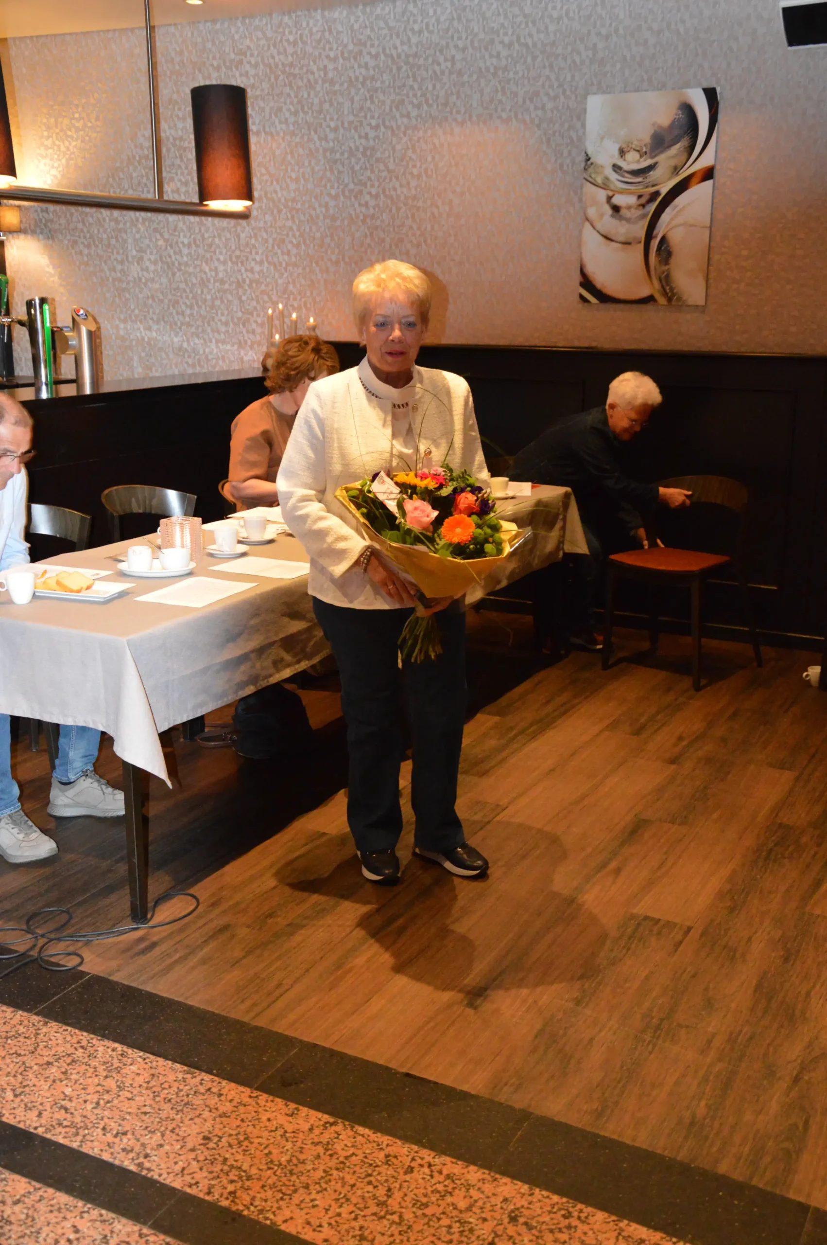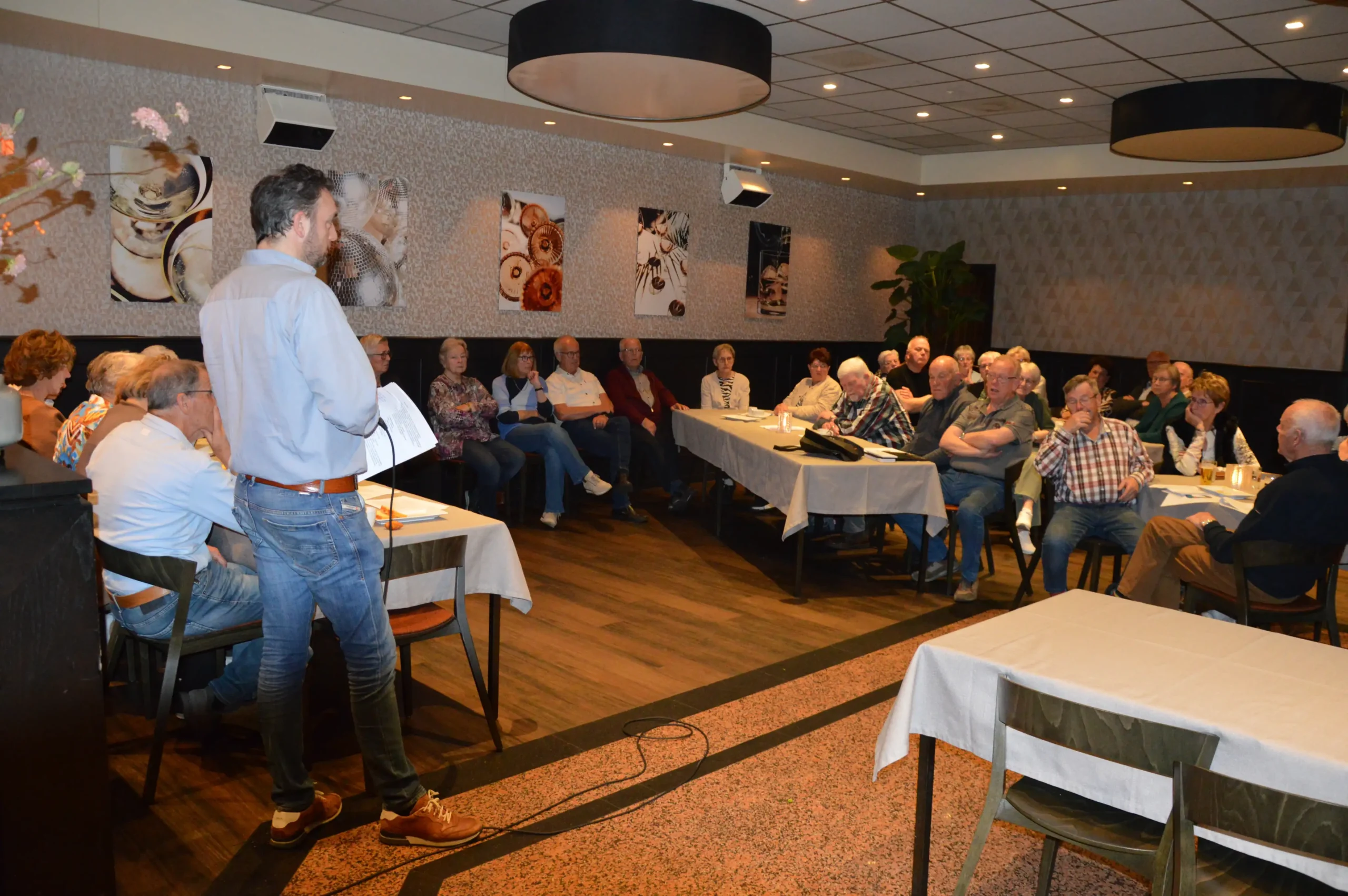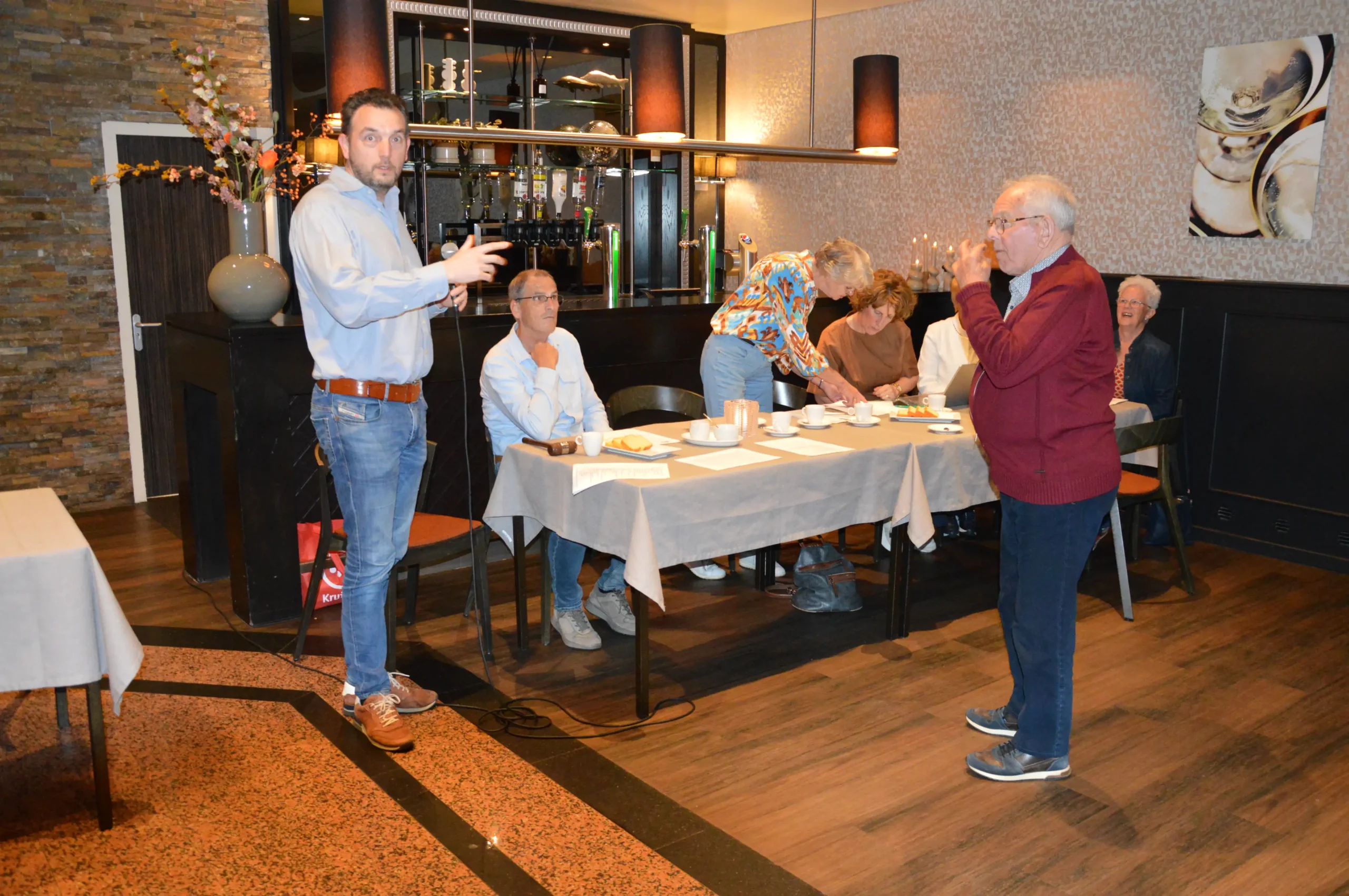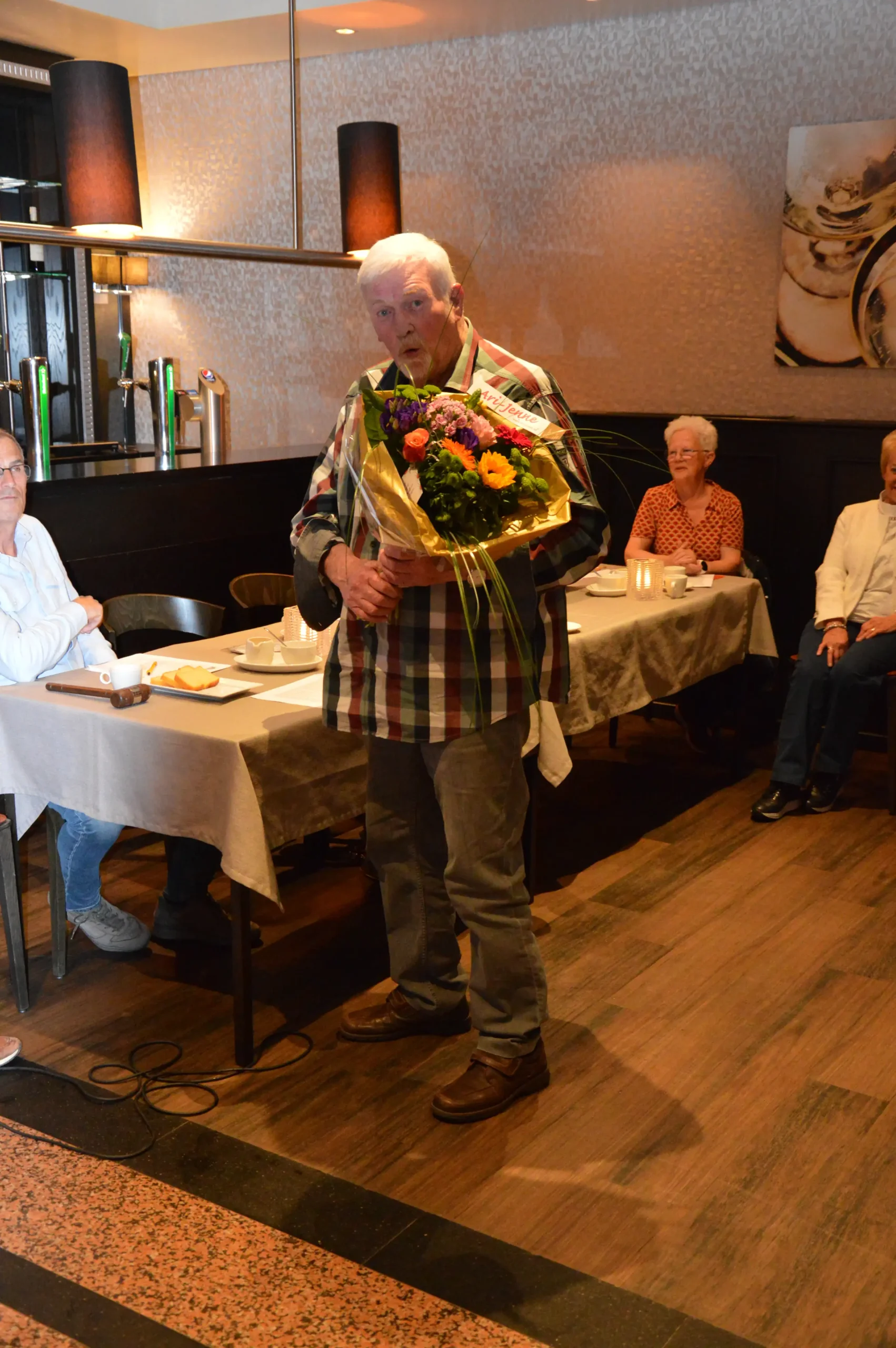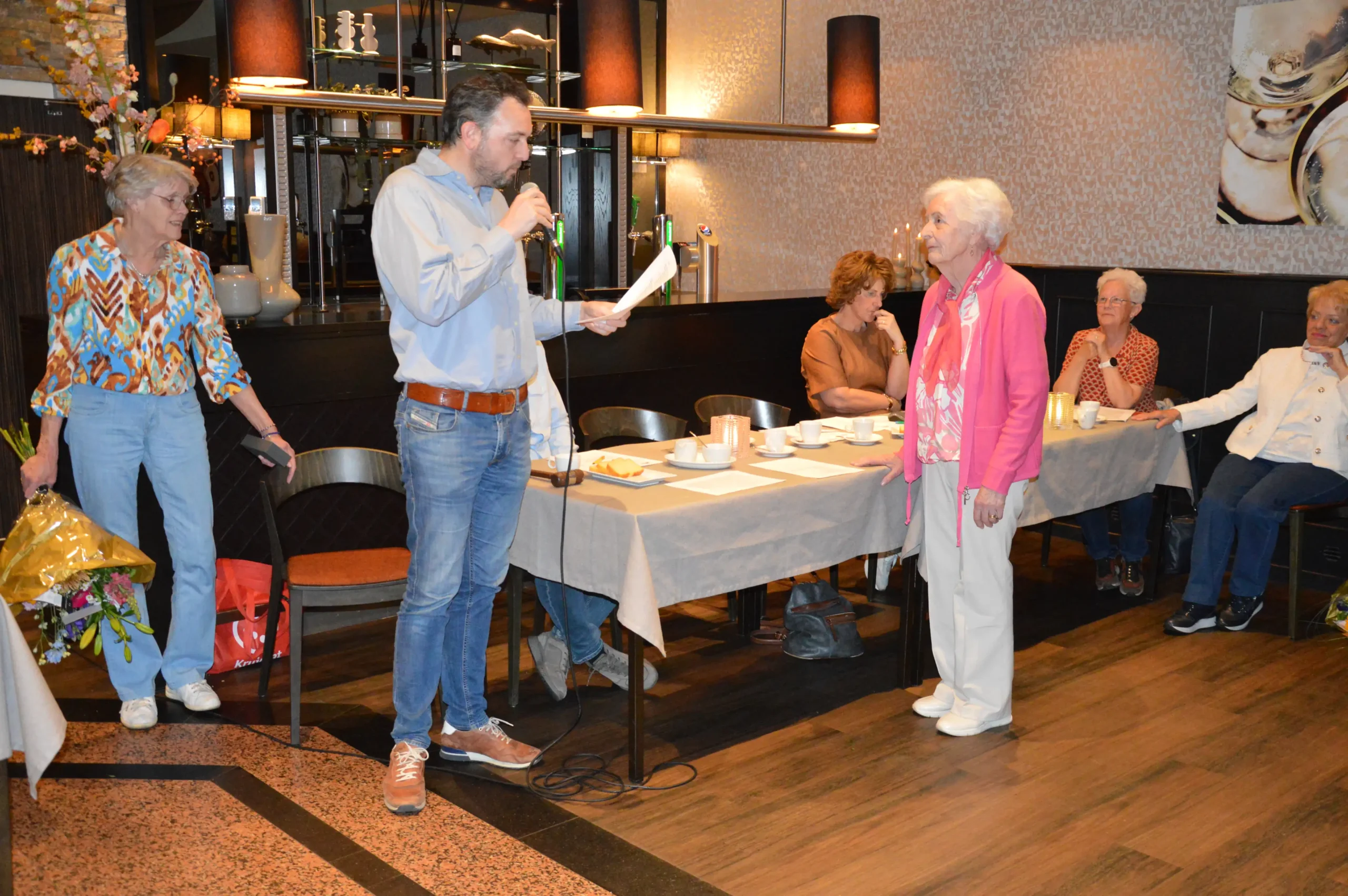 Vlak voor de pauze was er speciale aandacht voor de jubilarissen. Vijf vrijwilligers – Frans Gielis, Clazien Heesakkers, Arna en Wies van Leur en Jan Roefs – zijn al 12,5 jaar actief voor de vereniging. Frans Gielis zorgt ervoor dat de post op de juiste adressen terechtkomt. Clazien Heesakkers houdt zich bezig met onder andere de doelgroepenlijst, de inkoop en het inpakken van kerst- en paasattenties en is als begeleider actief bij onze activiteiten.