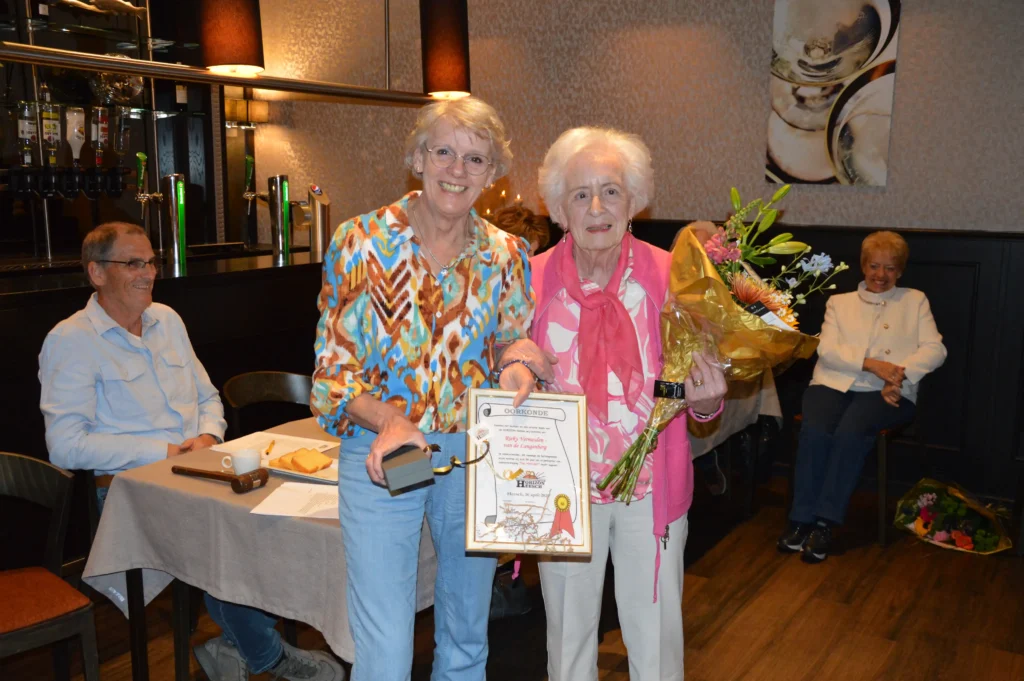 Tot slot waren er dit jaar twee bijzondere vrijwilligers die zich al jarenlang met hart en ziel inzetten voor de vereniging: Rieky Megens en Rieky Vermeulen. Rieky Megens was jarenlang actief binnen de handwerkgroep en maakte prachtige creaties. Rieky Vermeulen organiseerde jarenlang de kaartmiddagen, was betrokken bij het Maasland Senioren Orkest en actief binnen de dameshandwerkgroep. Beide dames ontvingen als blijk van waardering een mooie pen met inscriptie.