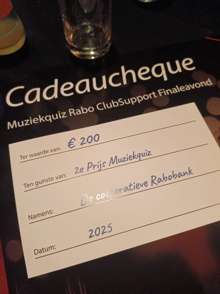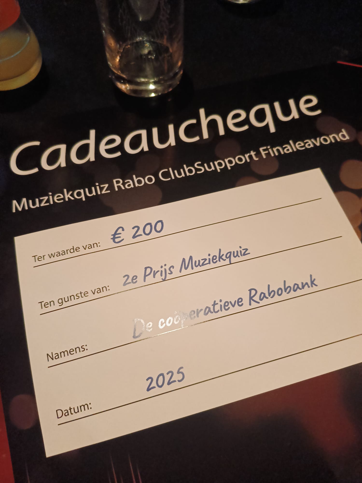 Daarnaast deden Peter en Roy mee aan de muziekquiz. Zij behaalden een knappe 2e plaats en ontvingen daarvoor nóg een cheque van € 200,-!