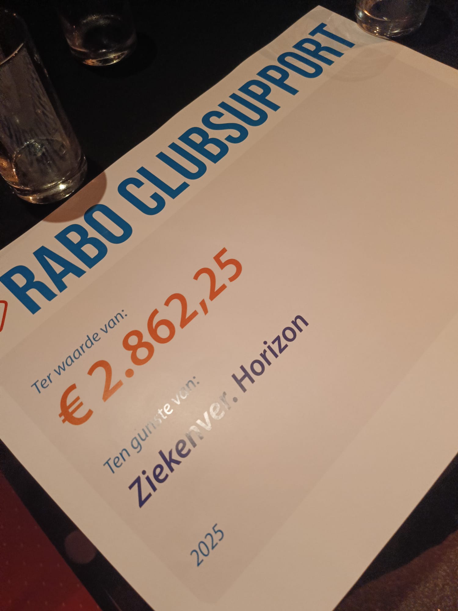 Onze penningmeester mocht namens de vereniging een prachtige cheque in ontvangst nemen van € 2.862,25. Wij zijn ontzettend blij met deze bijdrage en willen Rabobank en iedereen die op ons gestemd heeft van harte bedanken!